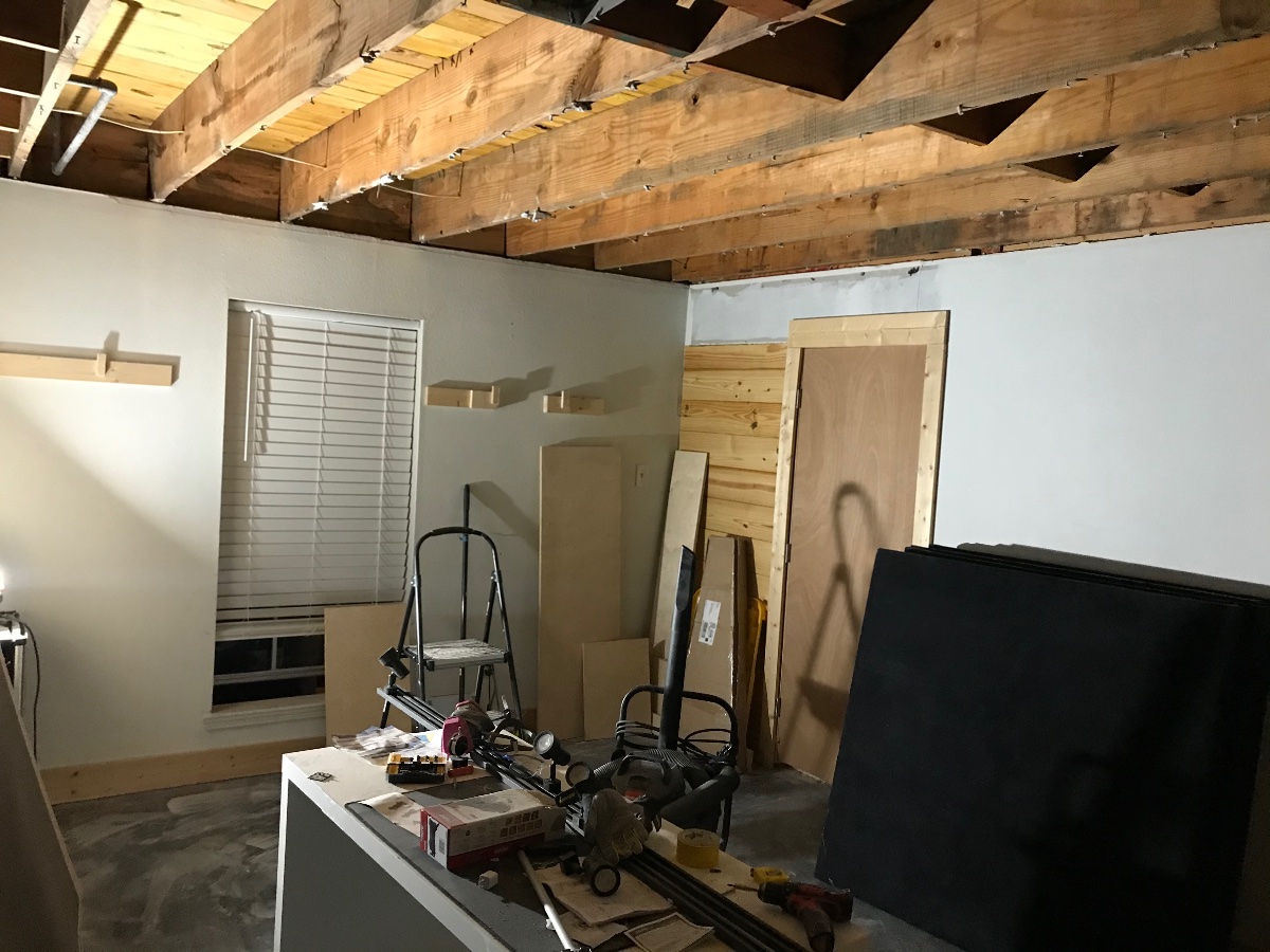 So I went into this phase with just the goal to open up my ceiling for the additional height/industrial feel it will give my music / gaming space - as well as build out my front wall, wire up some ceiling lights and additional outlets/switches, (there are no lights in this room!! It been dark and depressing..) and I am also going to put a ceiling fan in, or at least the wiring and receptical for one. I want to run some conduit behind my build to feed cables to my monitor and other gear, and in general cable manage my room to perfection. I also plan convert my existing 4ft x 4ft owens 703 panels (6 of them) into new panels and a cloud that are more fitting to the design I want to end up.